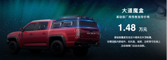 大道魔盒也开启预售并在10月起陆续交付,敢探者、大道·飞将、追光者,均可选配。魔盒基础版厂家预售指导价格为:1.48万元(包含后斗箱体及车顶帐篷,如需选配内部组件,如托盘、抽屉、边柜等可在线上及经销商门店自由选购)。